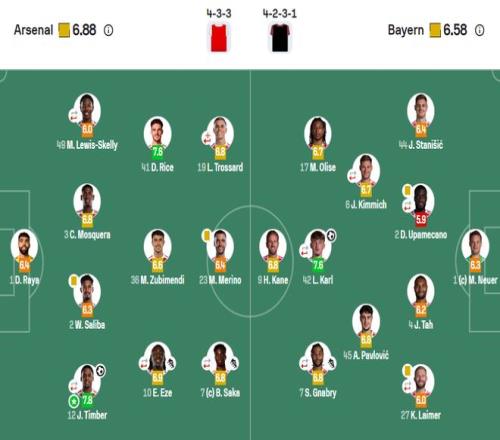 阿森纳31拜仁,全场评分出炉:不是赖斯高居第一,诺伊尔不及格