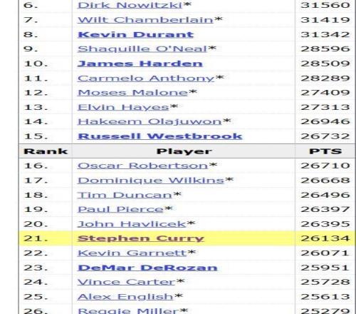 目前库里以26134分排名历史第21位,距离第20的绿军名宿哈弗里切克仅差261分。