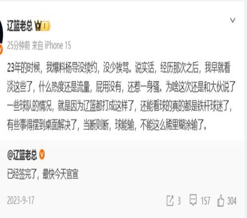 这个消息应该是比较真实的,“辽篮老总”随后继续补充:23年的时候,我爆料杨导没续约,没少挨骂。说实话,经历那次之后,我早就看淡这些了,什么热度还是流量,屁用没有,还惹一身骚。为啥这次还是和大伙说了一些球队的情况,就是因为辽篮都打成这样了,还能看球的真的都是铁杆球迷了,有些事得摆到桌面解决了,当断则断,球能输,不能这么稀里糊涂输了。